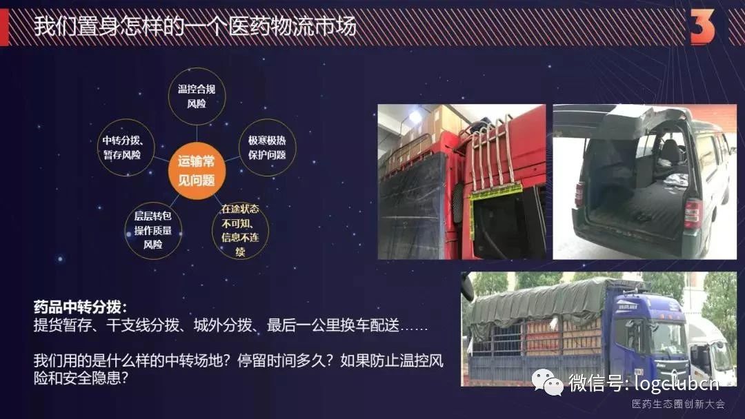 極寒、極熱情況下,夏天最高溫度40度,怎么樣保證藥品的質(zhì)量?在途的狀態(tài),尤其是運輸這一端,在座的藥廠、批發(fā)商不管是自己配送還是委托第三方配送,如何能確保是百分之百的可知、可視嗎?我們在運輸這一塊也有層層轉(zhuǎn)包。所以說藥品運輸風險是非常值得關注的一個點,這只是我們調(diào)研拍到的一些照片,風險更大的照片我沒有展示出來,因為放照片的目的不是曝光。