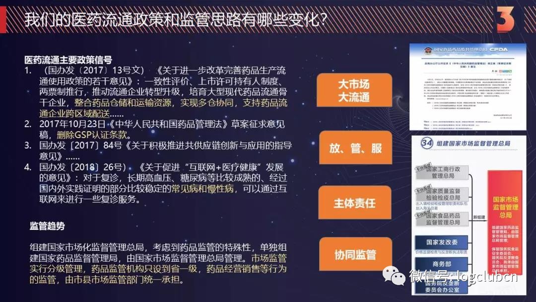 醫(yī)藥流通政策和監(jiān)管思路有哪些變化?首先大市場、大流通,我們要打破區(qū)域分割的局面,政府該放的要放,該管的要管,做好服務,這是一個導向。責任怎么落實?生產(chǎn)企業(yè)是追溯主體責任,委托企業(yè)要對被委托企業(yè)進行監(jiān)管,所以一定要有主體責任的意識。在監(jiān)管層面會怎么樣呢?協(xié)同監(jiān)管,協(xié)同監(jiān)管體現(xiàn)在哪方面?比如說跨省協(xié)同監(jiān)管,可能以后在監(jiān)管層面,不管是商務流通還是藥監(jiān)層面,跨省合作、跨省共識、跨省標準統(tǒng)一是一個趨勢,政府也在謀求協(xié)同。在藥監(jiān)層面和衛(wèi)計委層面對醫(yī)院物流的監(jiān)管,對疫苗接種點的監(jiān)管都會有更多的配合和延伸。