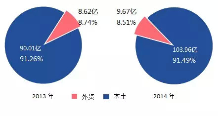 2014年安徽醫療終端本土企業市場規模為103.96億,增長率上升了15.42%,份額從91.26%上升到91.49%,減少了0.22%; 外資企業市場規模僅有9.67億,增長率為12.19%。