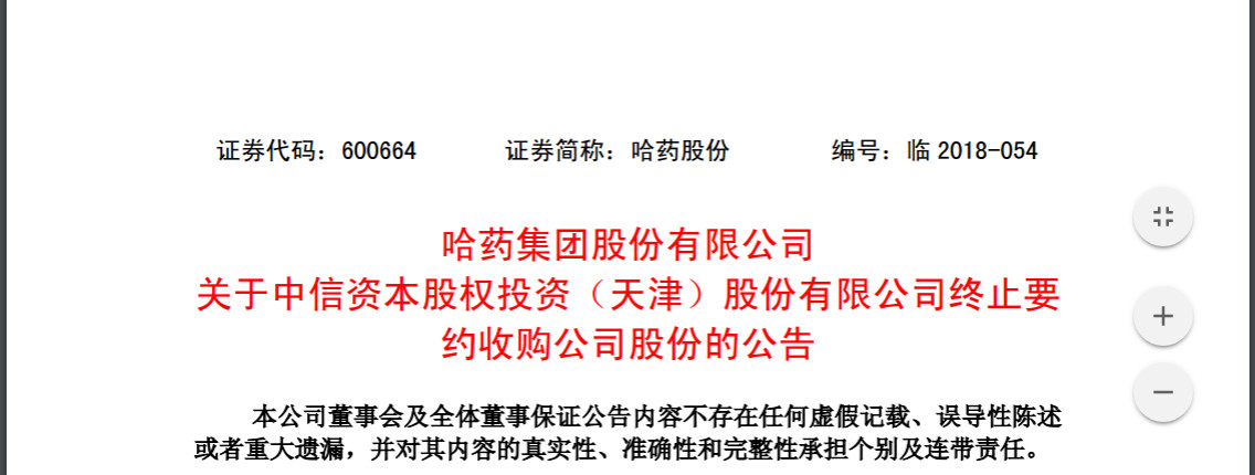 6月21日,哈藥股份發布公告,宣布中信資本終止對其要約收購。哈藥集團混改之路,暫時停止。 ▍中信謀求15億成哈藥集團實控人 哈藥集團混改籌劃時間近10個月,正式啟動于去年9月,同年12月25日,混改方案浮出水面。 2017年12月25日,哈爾濱市國資委、中信冰島、華平冰島、哈藥集團與中信資本醫藥簽署《關于哈藥集團有限公司之增資協議》。 根據上述協議約定,中信資本醫藥對哈藥集團實施增資并認購哈藥集團新增注冊資本15億元。 本次增資完成后,中信資本控股旗下三家企業(中信冰島、華平冰島、中信資本醫藥)合計持有哈藥集團60.86%的股權,哈爾濱市國資委持有哈藥集團的股權下降為32.02%,中信資本控股將成為哈藥集團的間接控股股東。 哈藥集團的實際控制人將由哈爾濱市國資委變更為中信資本控股。 當時考慮到中信資本直接持股的法律障礙,中信資本還指定其境內子公司中信資本天津對本次要約收購中哈藥股份A股上市流通股份履行要約收購義務,并由中信資本天津持有接受要約的股份。 然而,隨著政策的變化,中信資本的增資擴股還是遇到了障礙。 ▍審批進行大半 在10個月的時間里,中信資本增資事宜的審批,已經進行了大半。 2017年12月25日,哈爾濱市國資委、中信冰島、華平冰島、哈爾濱國企重組管理顧問有限公司和哈藥集團與中信資本醫藥簽署《關于哈藥集團有限公司之增資協議》。 2017年12月25日,哈藥集團召開董事會,同意中信資本醫藥對哈藥集團實施增資,并就上述增資相關事宜簽署增資協議。 2018年1月10日,哈爾濱市國資委轉發了《哈爾濱市人民政府關于對哈藥集團增資有關事宜的批復》(哈政發[2018]1號),哈爾濱市人民政府原則同意哈藥集團實施增資擴股。 2018年4月25日,中信資本控股收到《商務部經營者集中反壟斷審查不予禁止審查決定書》(商反壟審查函[2018]第13號)。 至此,本次交易尚需黑龍江省國資委、國務院國資委等有權部門審批。 ▍政策有變,哈爾濱國資委要求終止 6月20日,哈爾濱市國資委出具《關于終止本次哈藥集團增資擴股有關事宜的通知》,具體內容如下: 因哈藥集團有限公司增資擴股導致國有股東間接轉讓上市公司股權,按照國務院國資委、證監會《國有股東轉讓所持上市公司股份管理暫行辦法》(第19號令,以下簡稱“19號令”)相關規定,我委及時履行了逐級審批程序。 2018年5月16日,國務院國資委、財政部、證監會聯合印發《上市公司國有股權監督管理辦法》(第36號令,以下簡稱“36號令”),對上市公司國有股權監督管理進行有效規范。36號令將自2018年7月1日起施行,19號令同時廢止。 截至目前,經與黑龍江省國資委和國務院國資委溝通,本次哈藥集團增資擴股方案按照19號令要求在2018年7月1日前將無法獲得批準。 (圖片來源:界面新聞) 鑒于上述情況,考慮到國有股東間接轉讓上市公司股權事項相關政策規定出現重大變化,經認真研究,終止本次哈藥集團有限公司增資擴股事項。 下一步,我委將根據哈爾濱市人民政府對我市國有企業混合所有制改革工作部署,按照36號令有關規定和證監會有關法律法規,在2018年7月1日36號令生效后及時啟動哈藥集團混合所有制改革工作。” 鑒于以上情況,中信資本醫藥依據《關于哈藥集團有限公司之增資協議》對哈藥集團的本次增資已無法繼續進行。 也就是說,資產總額達160多億的哈藥集團仍以國資占主導地位。 ▍哈藥集團資產總額達160億 據哈藥集團官網信息,目前,哈藥集團為中外合資企業。哈爾濱市國資委占45%,中信資本冰島投資有限公司持股22.5%,華平冰島投資有限公司持股22.5%,哈爾濱國企重組管理顧問有限公司持股10%。 哈藥集團旗下擁有哈藥股份,人民同泰兩家上市公司(哈藥集團持有哈藥股份46%股權,哈藥股份持有人民同泰74.82%股權)。 2017年,哈藥集團資產總額162.56億元;固定資產39.28億元;凈資產94.67億元;實現營業收入123.51億元;利潤總額7.02億元;凈利潤5.01億元,利稅18.1億元。 哈藥集團2017年銷售收入超億元的品種達10個,擁有“哈藥”、“三精”、“蓋中蓋”知名品牌。據悉,僅“哈藥”的品牌價值就達238.29億元。 而人民同泰主營醫藥批發和零售業務。有人民同泰醫藥連鎖店319家,年營業額近13.5億元。 其下屬藥品批發企業與黑龍江省內730家醫療機構,近1200家第三終端,890家商業客戶開展合作,三級以上醫院的市場覆蓋率近100%,二級以上醫院的市場覆蓋率達90%以上。 根據商務部發布的《2016年藥品流通行業運行統計分析報告》顯示,2016年人民同泰批發業務收入在全國藥品批發企業中排名第22位,零售業務銷售總額在全國零售企業中排名第16位。 如此的市場體量,使得一段時間以來,哈藥集團的混改頗受關注。預計不久之后,哈藥集團的混改將再一次啟動,業內多猜測,下一次還可能有中信資本的身影。
