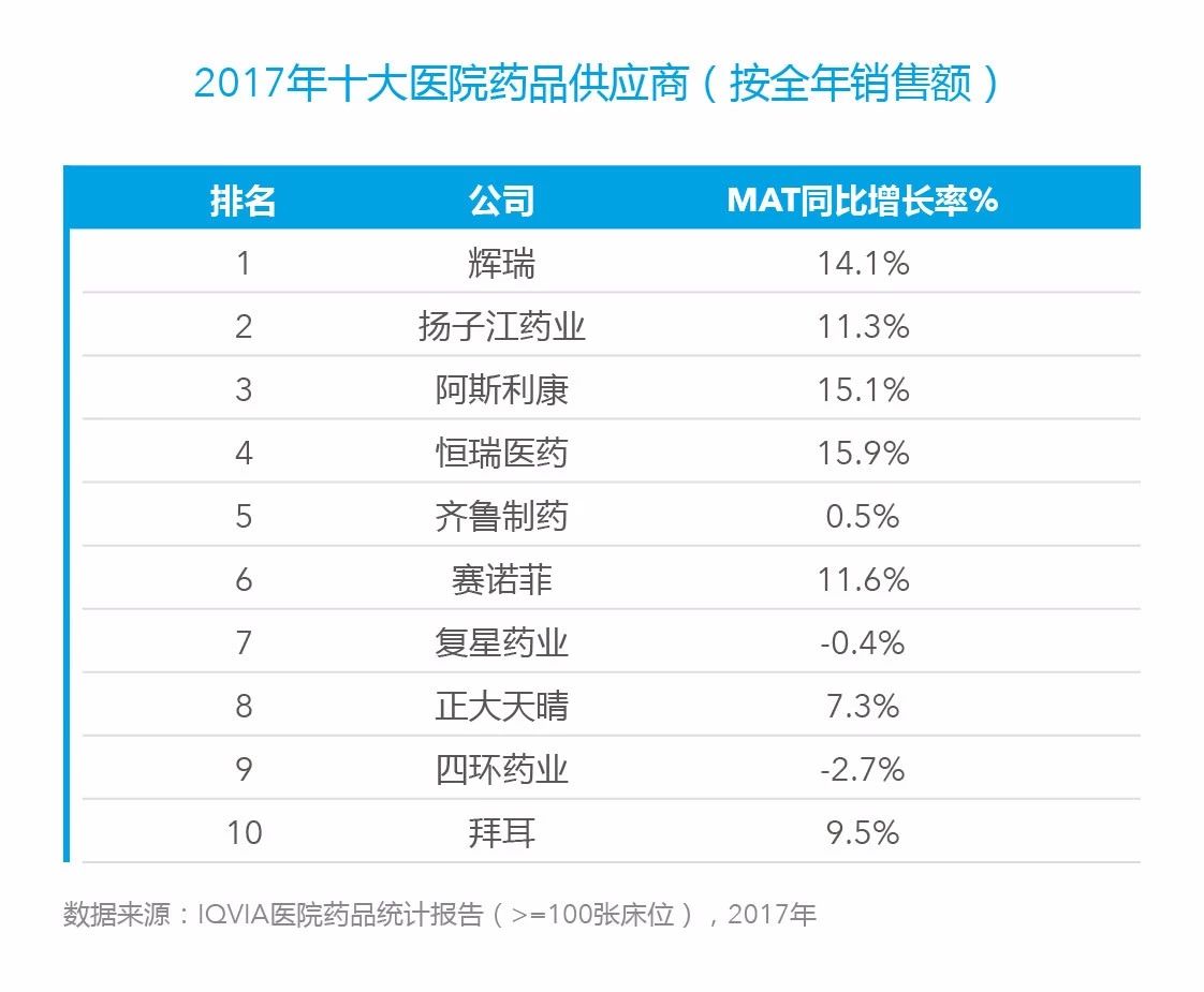 跨國企業和本土企業2017全年銷售額分別為1876億人民幣和5582億人民幣。中國醫院醫藥市場的增長主要由藥品銷量拉動,在藥品集中招標和采購以及高價藥談判的影響下,跨國企業和本土企業藥品的價格都呈現負增長,分別下降3.5%和2.8%,但是,政策對本土企業的影響更大,其藥品的銷量增長較為平緩,僅增長2.8%,跨國企業的銷量增長11.3%。前十大醫院藥品供應商中,跨國藥企占到4席,且市場增速明顯高于平均增速。