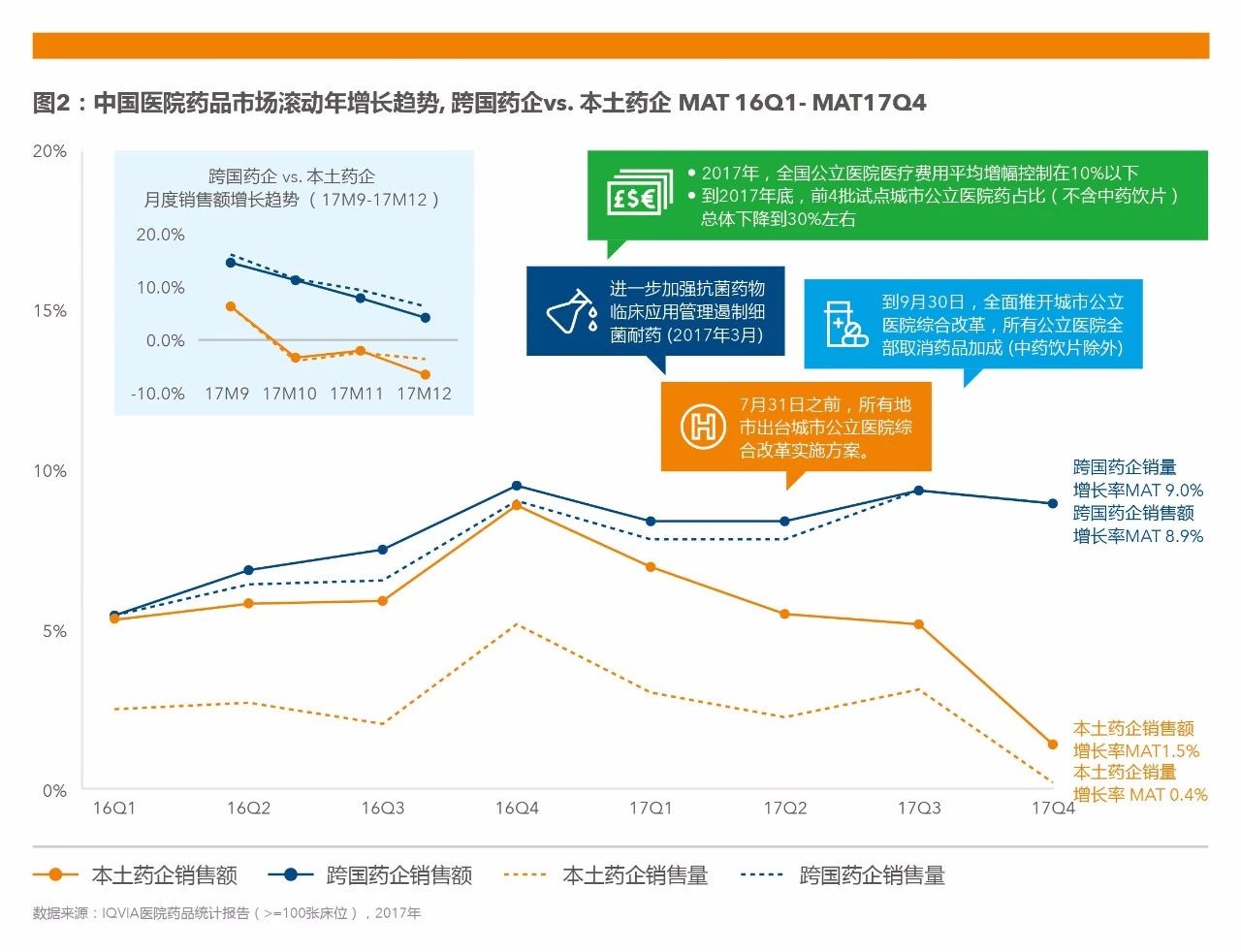 2017年中國醫院藥品市場總銷售額*達到7457億人民幣,全年增長率為3.3%,相比2016年9.2%的全年增長率下降較為明顯。由于受到一系列政策的影響,如公立醫院改革、醫保控費和藥占比控制等,本土企業受到較大的沖擊,2017全年增長率僅為1.5%,反觀跨國企業,增長率為8.9%,與2016年增長率相比僅呈小幅度下降。(*銷售額:醫院藥房采購金額)