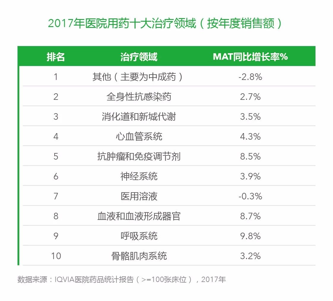 從治療領域來看,2017年,中成藥仍然保持藥品品類中的首位,但是全年增長率僅為-2.8%。全身性抗感染藥、消化道和新陳代謝分別位列二、三。呼吸系統、血液和血液形成器官、抗腫瘤藥和免疫調節劑領跑全年銷售同比增長率前三位,高于平均增長率,為9.8%、8.7%和8.5%。