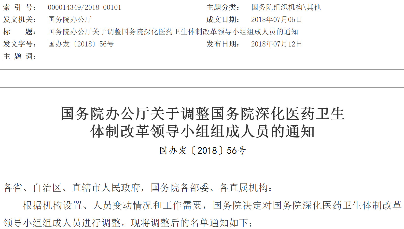 今日(7月12日),國務院辦公廳發布通知,根據機構設置、人員變動情況和工作需要,國務院決定對國務院深化醫藥衛生體制改革領導小組組成人員進行調整。現將調整后的名單通知如下: