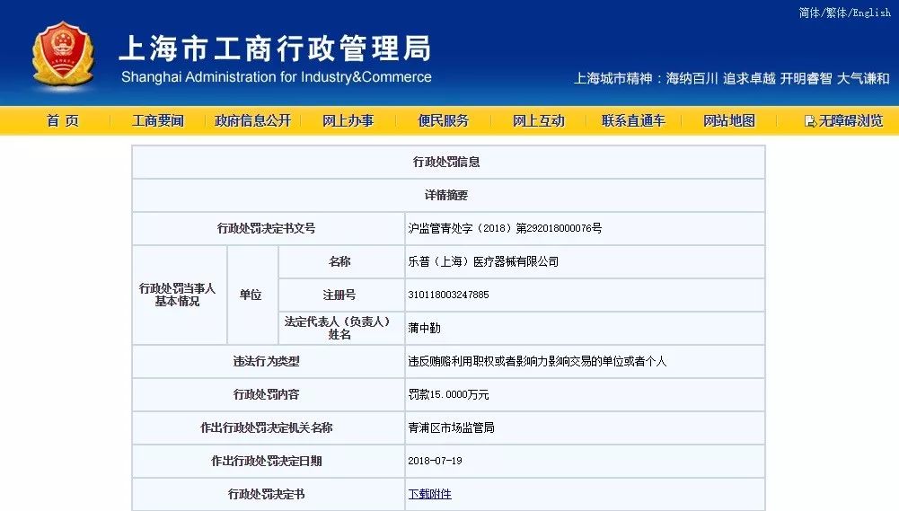 上海工商處罰樂普醫療的結果