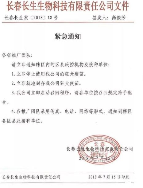 7月15日下午,一份長春長生的內部文件在網絡上流傳。該文件由長生生物董事長高俊芳簽發,為保證用藥安全,長春長生正對有效期內所有批次的凍干人用狂犬病疫苗(Vero細胞)全部實施召回。長生生物工作人員表示,對有效期內全部產品的召回是長生生物自主行為,并不是國家藥監局的要求。