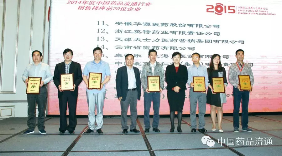 “2015中國(guó)藥品流通行業(yè)資本論壇”于5月13日在上海虹橋喜來(lái)登太平洋大酒店舉行。此次論壇公布了2014年度中國(guó)藥品流通行業(yè)批發(fā)和零售企業(yè)主營(yíng)業(yè)務(wù)收入兩項(xiàng)百位排序,并為批發(fā)企業(yè)主營(yíng)業(yè)務(wù)收入前20名的企業(yè)舉行了授牌儀式。原國(guó)家食品藥品監(jiān)督管理局副局長(zhǎng)任德權(quán),商務(wù)部市場(chǎng)秩序司原巡視員溫再興、中國(guó)醫(yī)藥商業(yè)協(xié)會(huì)執(zhí)行會(huì)長(zhǎng)付明仲、中國(guó)醫(yī)藥商業(yè)協(xié)會(huì)常務(wù)副會(huì)長(zhǎng)武濱出席了授牌儀式,并為20強(qiáng)企業(yè)頒發(fā)銘牌。