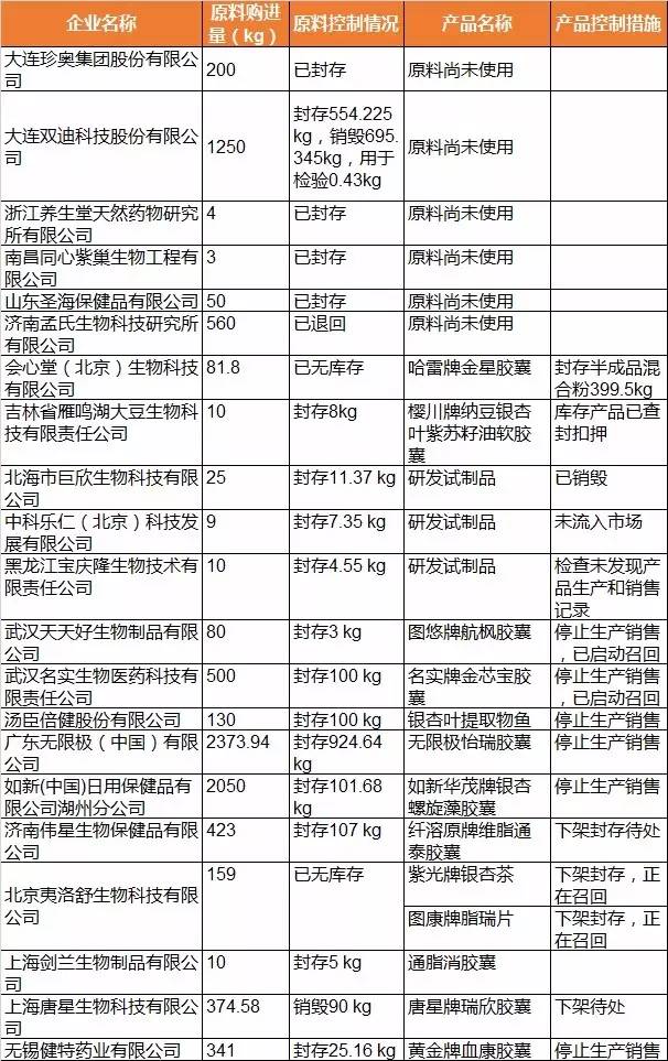 二、經有關省級食品藥品監管部門核查,上述21家企業自2013年1月開始至案發日,從桂林興達藥業有限公司和寧波立華制藥有限公司購進銀杏葉提取物8644.32公斤,目前已封存原料2208.68公斤,退回原料559.98公斤,銷毀原料785.34公斤,其他5090.32公斤原料已使用。其中:大連珍奧集團股份有限公司、大連雙迪科技股份有限公司、浙江養生堂天然藥物研究所有限公司、南昌同心紫巢生物工程有限公司、山東圣海保健品有限公司、濟南孟氏生物科技研究所有限公司等6家企業購進的違法銀杏葉提取物尚未使用,已全部封存、退回或銷毀。