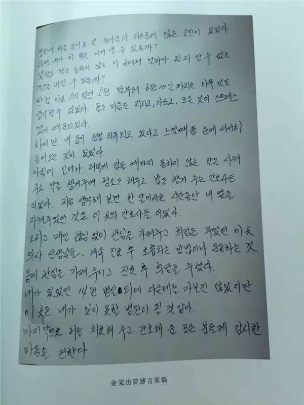 出院前,金某發表了一份書面的出院感言,稱“在這里治療的這段時間,除了14號病房外的其他地方我都沒有去過,但是我相信,這里是我終身難忘的一家醫院。最后,我向所有為我治療、為我護理以及關心我的人表示由衷的感謝!謝謝大家!”