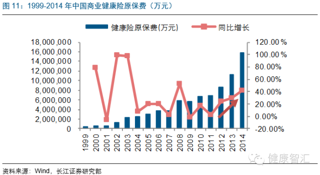 2000年以來,我國商業健康險年均增速約25%,而2014年增速提升至41%,市場規模達1587億元,5年內達到萬億級別已成市場共識。可以看到,在鼓勵政策放風后,我國商業健康險市場已駛入快車道,是從根本上改善我國醫療支付格局的唯一途徑。