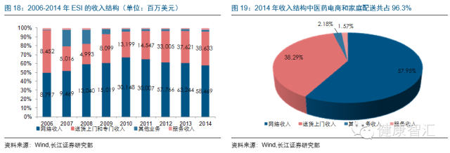 pharmacy)。2014年報數據顯示,醫藥電商收入占比高達58%,藥品的家庭配送服務收入占比約為38%,合計超過96%,并且該比例呈現上升趨勢。
