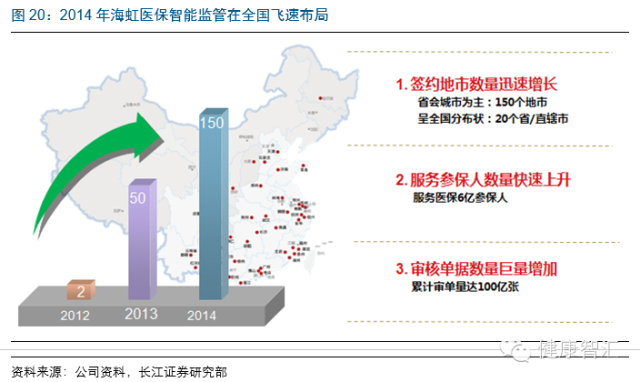 PBM系統的控費審核僅僅是海虹控股的叩金石,由控費向掌握數據資源、醫療落地服務資源,進而向綜合醫療服務延伸才是其核心宗旨。2015年6月11日,海虹控股公告與湛江簽署《湛江市基本醫療保險支付審核服務委托協議》,全權委托海虹作為專業服務機構進行湛江市醫保基金審核、支付、評價以及參保人服務等,標志著海虹PBM業務從“控費”升級為“醫保基金全權管理”,是屬國內首創,體現出公司強大的頂層資源整合能力,有望在其他核心合作城市大范圍異地復制,具有劃時代意義!