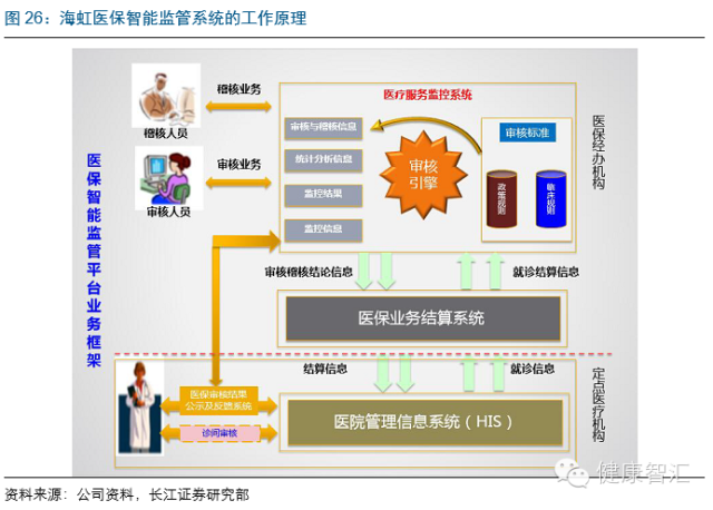 第四、可實現商保與醫保的同步結算直付。海虹與保險公司的合作,在核保核賠直付結算層面,一方面可助其實現自動審核理賠,取代高額、粗放的的人工核保核賠模式,并提高理賠準確性;另一方面,海虹與醫保局、醫院的深度合作關系,可幫助保險公司與醫保局、醫院達成三方合作關系,實現商業健康險與基本醫保的同步預警、監控、審核、結算。