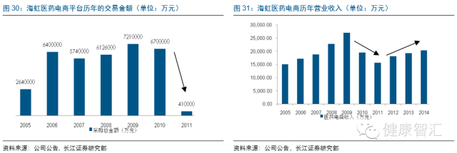 2010年以前海虹的醫藥電商年度交易額及營收規模保持穩步增長,而由于2010年受國家藥品招投標改革政策的影響,海虹醫藥電商交易平臺陸續被地方政府買斷遷移,因此營業收入出現萎縮。后續在地方政府鼓勵醫藥電商的政策支持下,公司已向全面的即時電子商務模式轉變,電商業務的交易總額與營業收入也呈現穩步增長態勢。