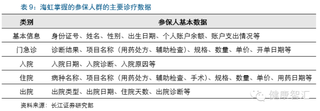 第二、PBM系統審核的患者診療記錄。只要患者需要醫保報銷、醫保局需要使用PBM系統鑒定診療行為的合理性,醫院均需要將患者的診療數據上傳到PBM系統。通過該渠道,海虹可掌握8億參保人群從門診到住院、出院整個醫療過程中的檢查、診斷、用藥、手術等所有診療數據。