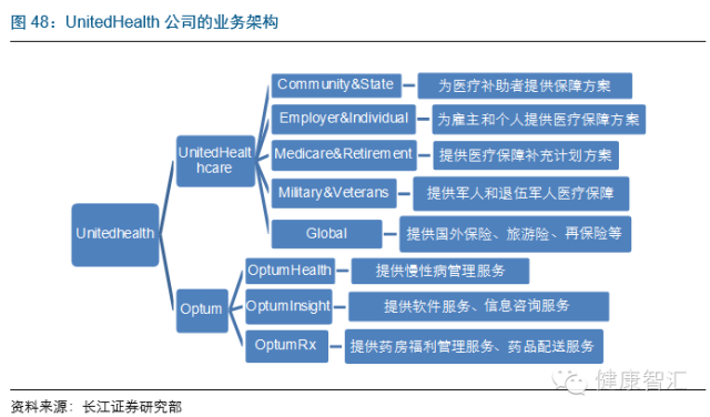 +TMT公司”的架構,旗下包括兩大平臺,即UnitedHealthcare和Optum,前者屬于保險業務,2014年收入占比71.3%,后者又分為三個平臺分別提供慢性病管理(健康管理)、醫療軟件信息咨詢(TMT)和藥房福利配送服務(PBM)。