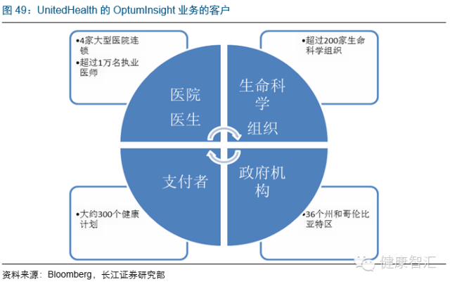 第四、OptumInsight,通過“重疾預測模型”等對過去的數據進行分析,預測未來理賠費的概率,數據包括診療數據、醫療價格、藥品價格等,為醫院、執業醫師、其他健康保險公司、政府機構、生命科學組織提供技術、運營、咨詢等服務。有效降低成本、提高臨床成效。