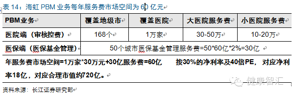 PBM業務存在兩個盈利點,即醫院端年服務費,及醫保基金管理服務費,收入空間約60億,對應市值空間約720億: