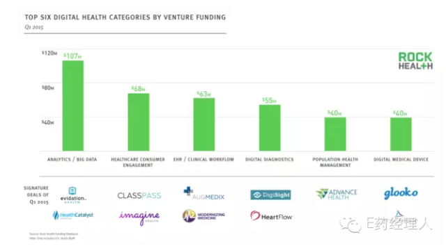 2014年,互聯網醫療是破紀錄的一年,交易總額超過40億美元,橫壓2013年兩倍之多,且是前三年的金額總和,可見市場熱錢涌動,大行業趨勢明顯。然2015年整體態勢現在還難下論斷,但第一季度統計數據已出,風險投資互聯網醫療領域的金額超過6.3億美元。在2015年第一季度互聯網醫療的投資領域中,排名前6的投資項目總金額占據61%,即3.73億美元,其金額由高到低分別是,大數據分析、醫療健康消費、EHR及診斷流程、數字化診斷、人口健康管理、互聯網醫療設備。